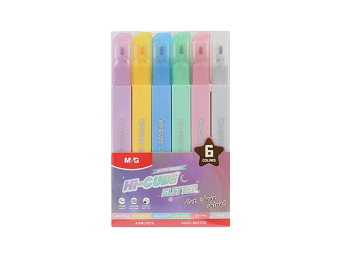 M&G Highlighter Pen Chisel Hi Cube Soft Nib Square Glitter Set Of 6 Colors Gentle