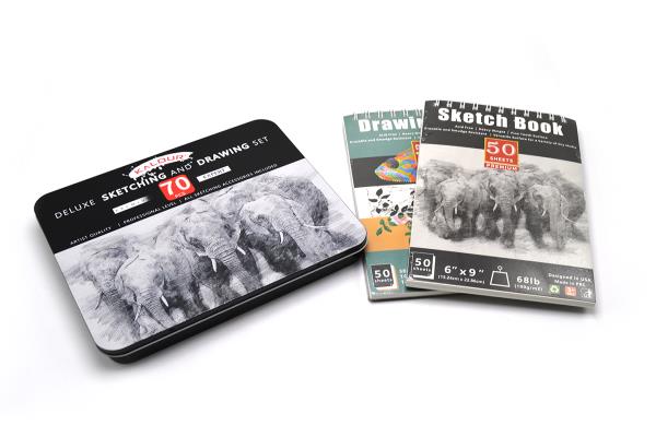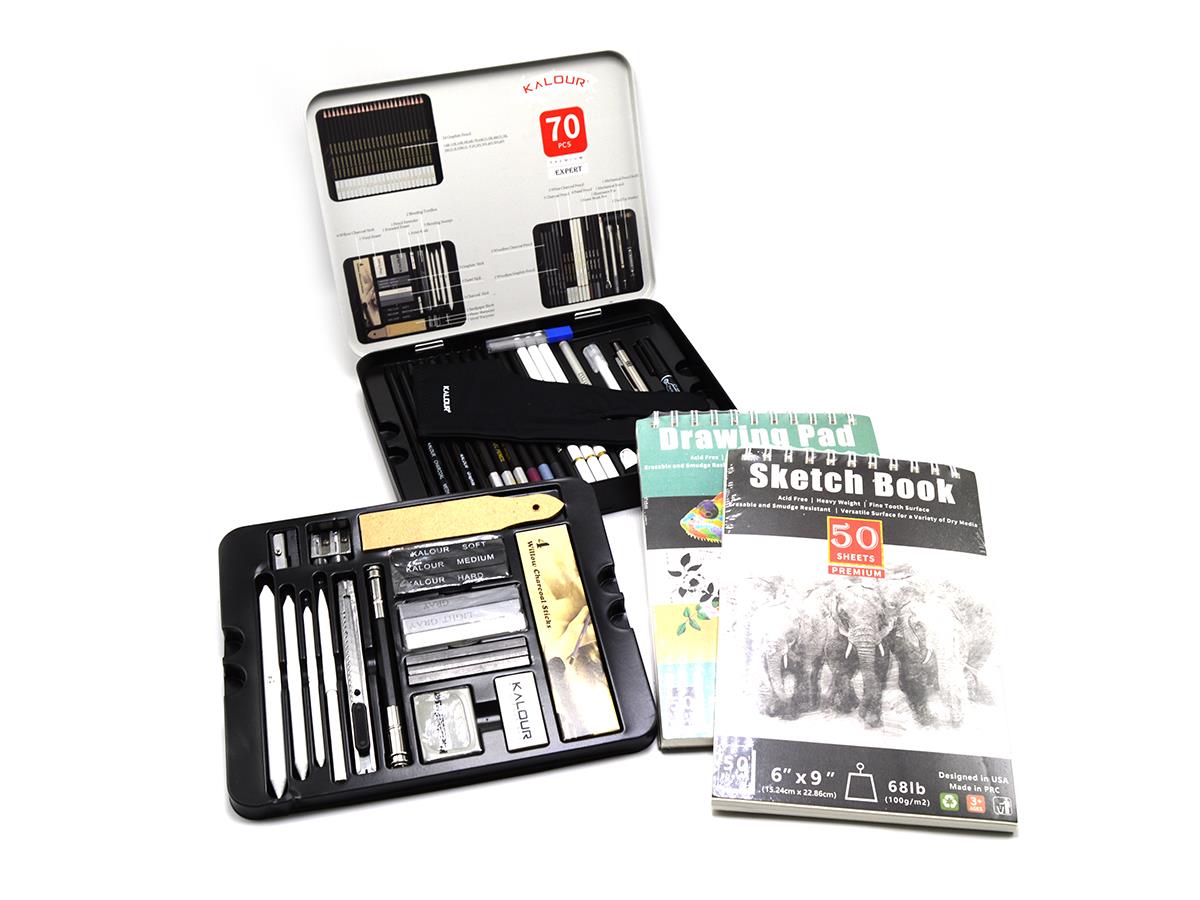 RYN Sketch And Drawing Pencils Set Of 70 Pcs Metal Case + 2 Pads Spiral