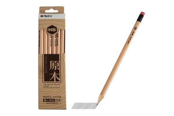 M&G Wooden Pencils HB Natural Color Hexagonal With Eraser 12 Pencils