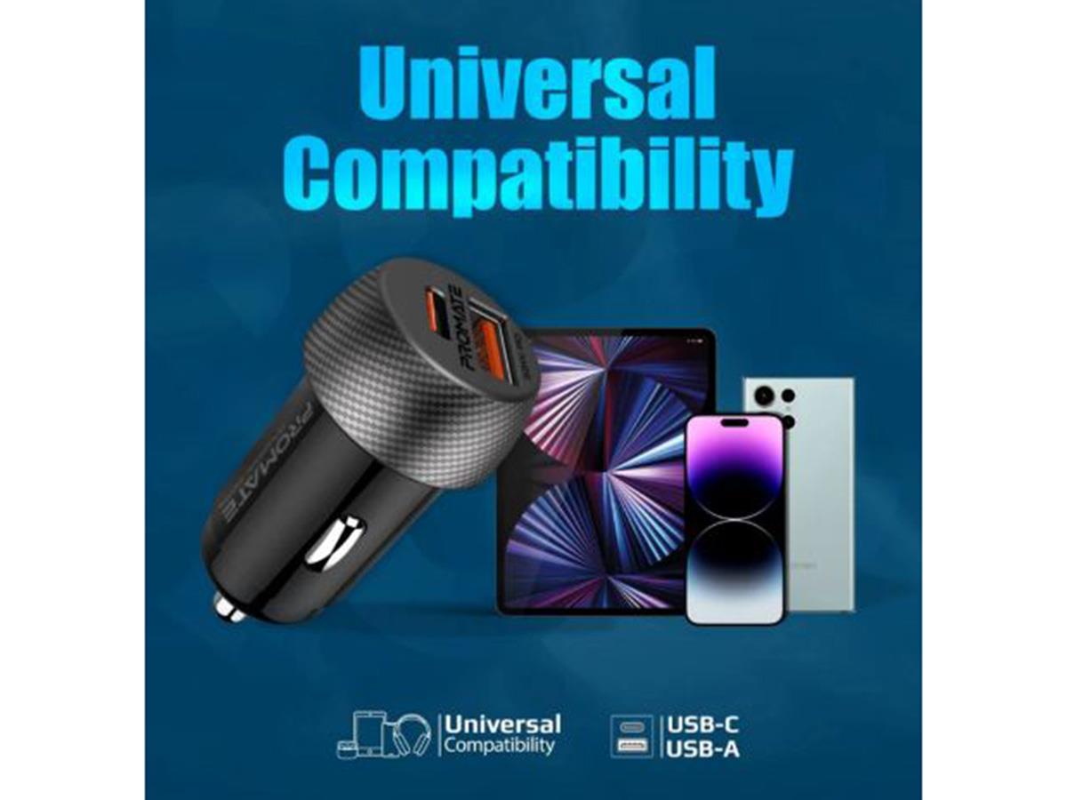 Promate Ultra-Fast Dual Port Car Charger Power Delivery &Qc 3.1 33W Black